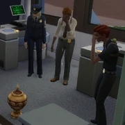 Detectives mourning in front of an urn of their deceased co-worker in The Sims iv: Become to Work. This urn is for an ordinary Sim.